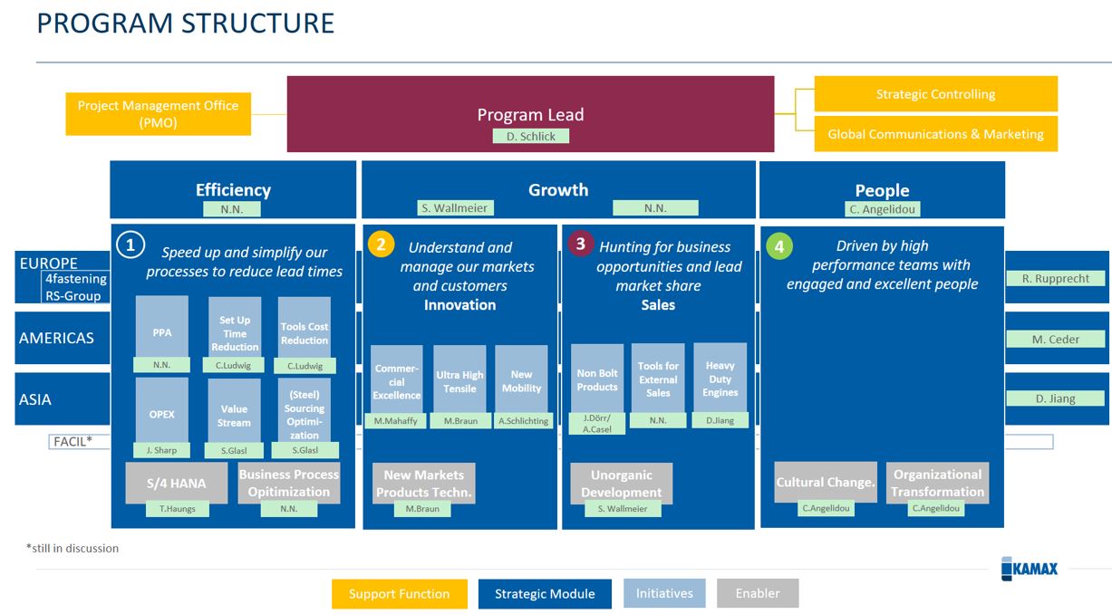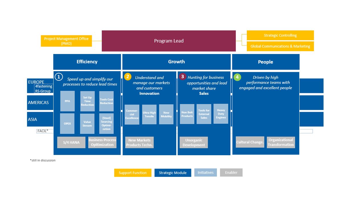 Based on the 'Strategic Directions', a new 'Program Structure' was established. The 'Core Strategy Team' is part of this new management structure. The Corporate Strategy & M&A department (Daniela Schlick) is responsible for project management. Based on the 'Strategic Directions' there are the modules Efficiency, Growth (here innovation and sales interests are combined) and People. A module supporter has been assigned to each module. And with the new 'Program Structure' the coordination with the regions is fostered. see 'Program Structure'.